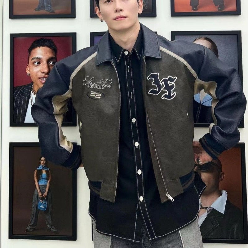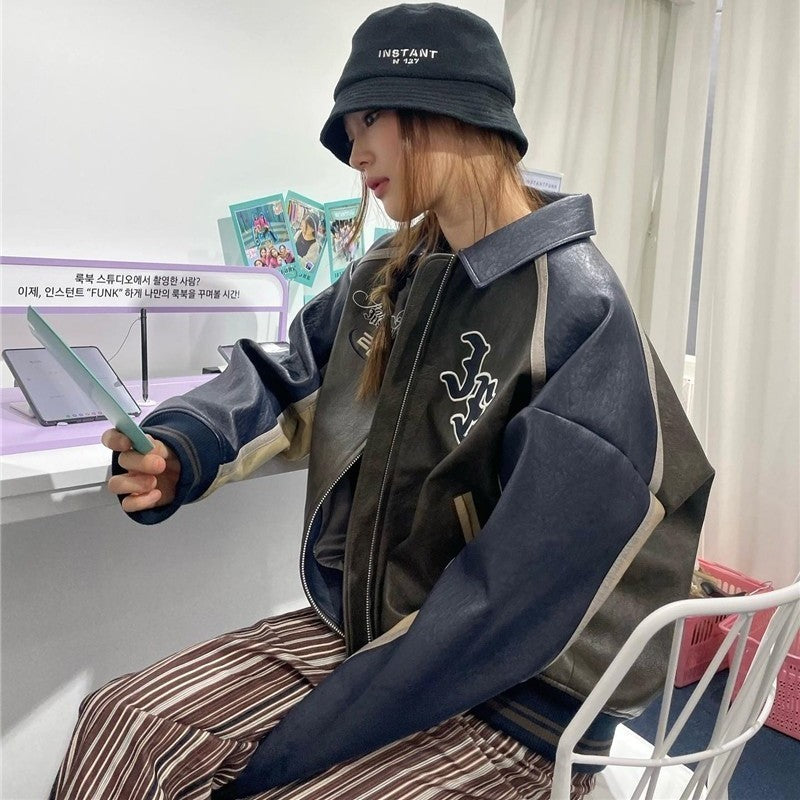New Loose Color Matching Retro Leather Coat Jacket For Men And Women