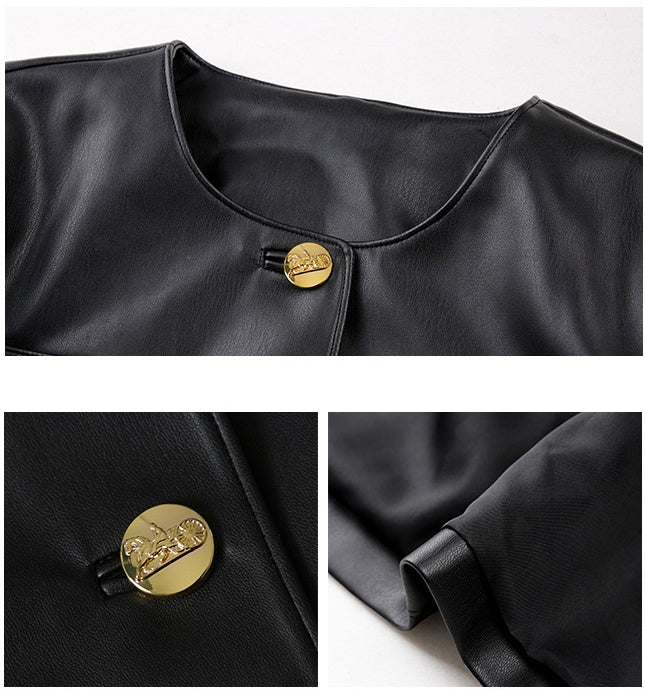 Black Round Neck Cardigan Casual Faux Leather Jacket